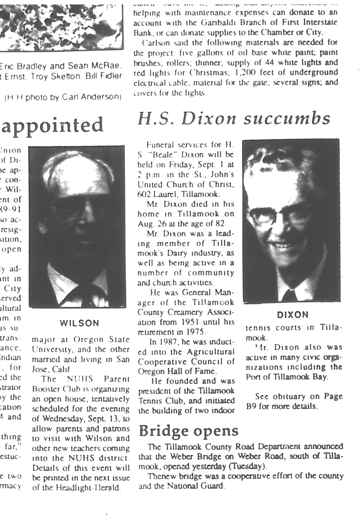 Beale Dixon Dies Beale Dixon died in 1989, and the Tillamook newspaper ran a front page notice and this obituary. (Credit: Headlight Herald, 8.30.89)