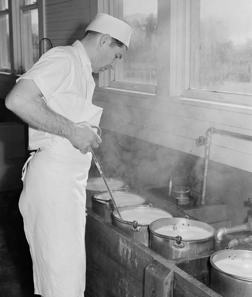 In this October 1941 photo, a cheesemaker heats the culture that will be added to milk to begin the cheesemaking process. The culture, with bacteria, was added to the warmed milk. Then coloring, made from annatto seeds, was added. Rennet made the milk coagulate. As former factory tour guide Linda Kirk said in the book Cheese War, “If anyone asked about rennet, I was ready to say that the factory used rennet made from the stomachs of veal calves. If no one asked, I would not elaborate on rennet.” Today, rennet is created in a laboratory.